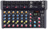 Compact format audio mixer with 2, 4 or 6 mono input channels, a stereo line input and a further minijack stereo input. Each mono mic/line channel has a combo XLR/jack input with +48V phantom power switchable in pairs for the XLR inputs. Each mic/line channel has a Gain control for matching the input source and a low-cut switch to filter out rumble or handling noise from microphones. Each mono channel also has High/Low EQ controls and an FX level control. Pairs of mono channels can be linked to act as a stereo left + right pair as required. The onboard foot-switchable DSP effects engine has 99 presets for delay, reverb and modulation effects, each of which can be adjusted using two parameter controls. An onboard Bluetooth receiver has an illuminated pairing button and independent volume control. The USB type-A port on the top panel is for playback of audio files or can be used to record the main outputs to a USB storage device or as an external audio device when connected to a laptop. Output is delivered to a pair of balanced XLR connectors to provide low noise operation for high quality studio or live performances.