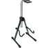 QL 791 GITAR STATIV EL- Patented design easily allows the QL/791 to conform to the contour of any electric guitar or bass.- Each lower guitar cradle independently adjusts, in both height and angle, out of the way of knobs, switches or input jacks.- Solidly constructed with high-grade steel and arc-welded joints for years of dependability.- Soft, rubberized cushioning protects guitars from scratches and will not mar finish.- Cushioned protector on height adjustable neck holder prevents the guitar from falling out of stand.- Rear adjustment knob firmly locks stand in any open position up to 38 cm wide and at the same time sets neck holder at the desired height.- Rotating leveling foot compensates for uneven floors.- Folds down to a convenient portable size for transport and easy storage.